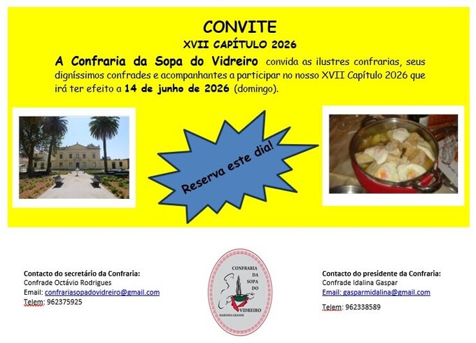A Confraria da Sopa do Vidreiro convida as ilustres confrarias, bem como os seus digníssimos confrades e acompanhantes, a participarem no XVII Capítulo 2026, que terá lugar no dia 14 de junho de 2026 (domingo). O convite apela à reserva desta data ...14 Jun