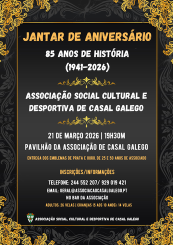 🎉 JANTAR DE ANIVERSÁRIO – 85 ANOS DE HISTÓRIA! 🎉 A Associação Social, Cultural e Desportiva de Casal Galego celebra 85 anos (1941–2026) e quer festejar contigo! 📅 21 de março de 2026 ⏰ 19h30 📍 Pavilhão da Associação de Casal Galego Durante o ...21 Mar -