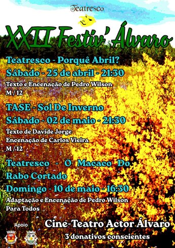 Cine-teatro Actor Álvaro 25 de abril . 21h30 PORQUÊ ABRIL | TeatrescoTexto e encenação: Pedro WilsonPúblico-alvo: M/12 02 de maio . 21h30 SOL DE INVERNO | TASETexto: Davide JorgeEncenação: Carlos VieiraPúblico-alvo: M/12 10 de maio . 16h30 O ...25 Abr a 10 Mai -