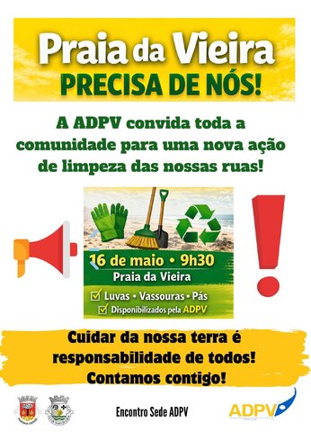 Praia da Vieira A ADPV convida toda a comunidade a participar numa caminhada aberta a todas as idades. Vamos promover atividade física, convívio e espírito comunitário, mostrando que juntos podemos reerguer a Praia da Vieira. Cada passo conta. Cada ...01 Mai -