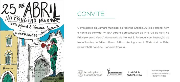 O Museu Joaquim Correia, na Marinha Grande, recebe a apresentação do livro “25 de Abril, no Princípio Era o Verbo”, da autoria de Manuel S. Fonseca, ilustração de Nuno Saraiva, da Editora Guerra & Paz, a ter lugar no dia 19 de abril, pelas 18h00.