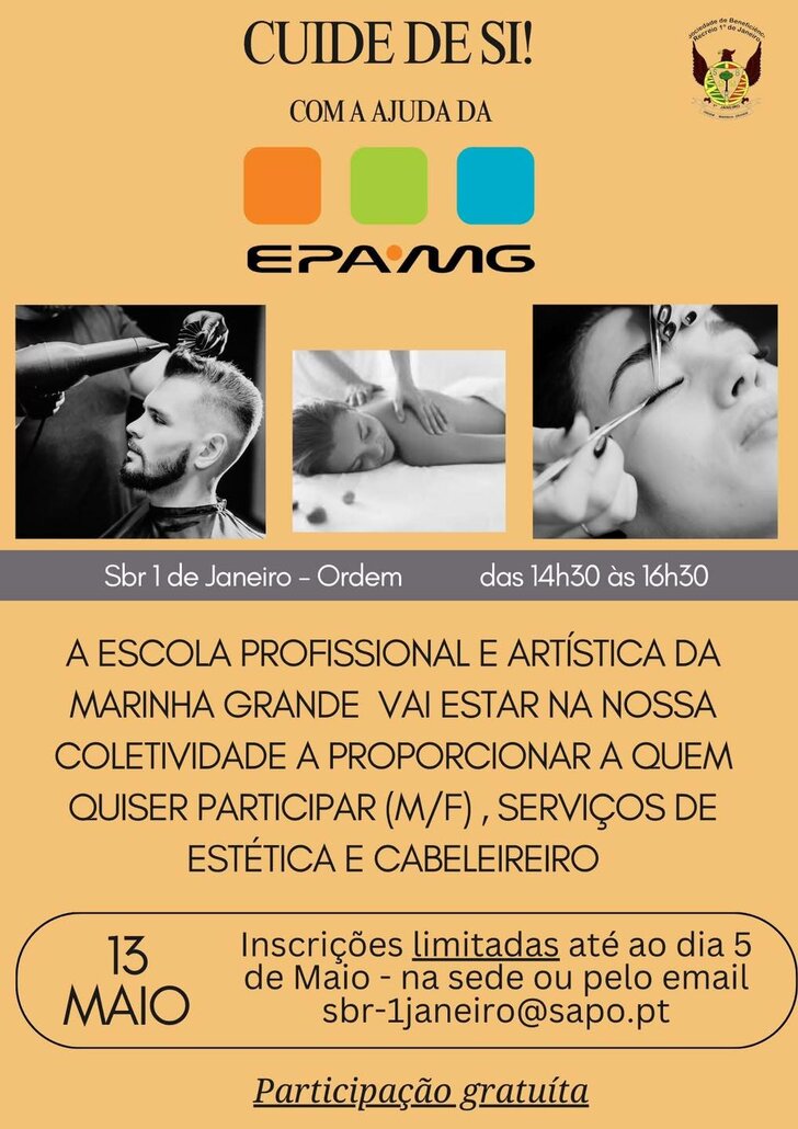 A Escola Profissional e Artística da Marinha Grande (EPAMG) estará presente na nossa coletividade para proporcionar, a todos os interessados (masculino e feminino), serviços gratuitos de estética e cabeleireiro.