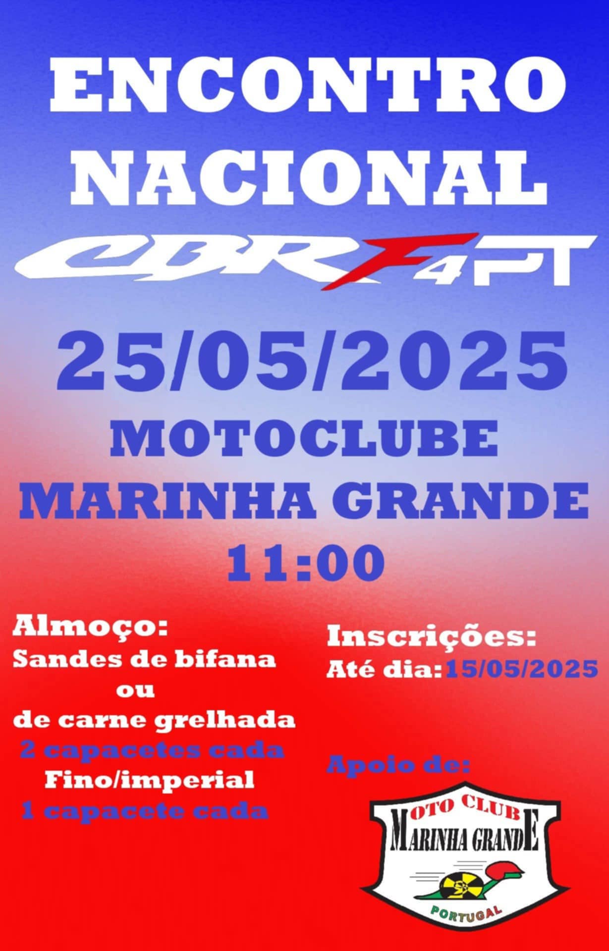 O Motoclube da Marinha Grande será palco do Encontro Nacional CBR4PT, um evento dedicado aos entusiastas das motas CBR e à comunidade motociclista em geral. Este encontro promete um dia de convívio, motores e boa disposição.