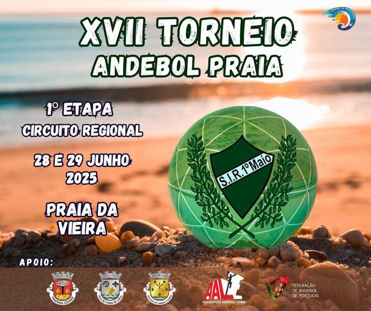 Nos dias 28 e 29 de junho de 2025, a Praia da Vieira será palco da 1.ª etapa do Circuito Regional de Andebol Praia, com a realização do XVII Torneio organizado pelo S.I.R. 1º de Maio.