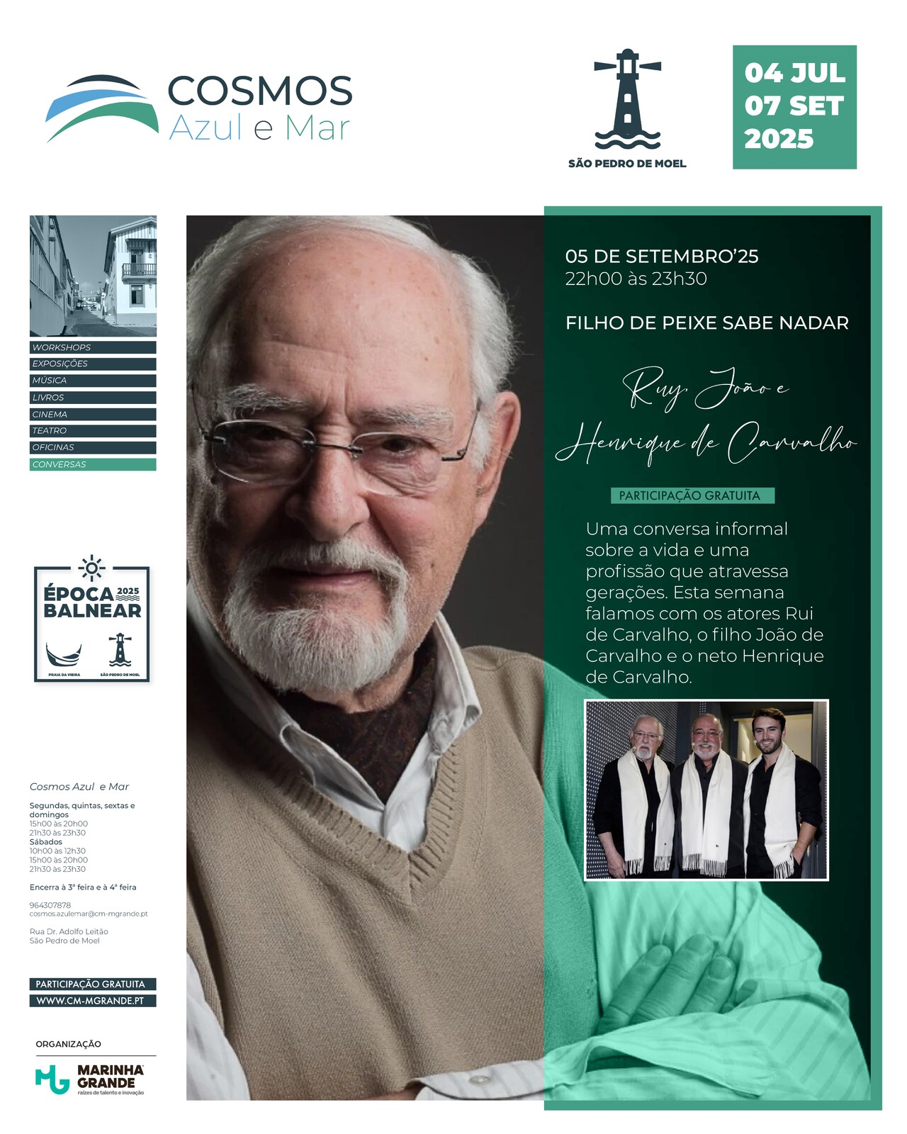 O ciclo de conversas promovido pelo Município da Marinha Grande prossegue no dia 05 de setembro de 2025, às 22h00, no Edifício Cosmos Azul & Mar, em São Pedro de Moel, com mais uma sessão de “Filho de Peixe Sabe Nadar”, desta vez com a presença do ator Ruy de Carvalho e seus descendentes, também atores, João e Henrique de Carvalho.