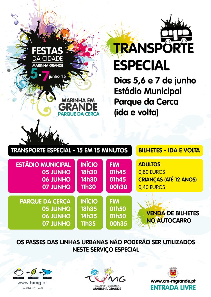 A TUMG – Transportes Urbanos da Marinha Grande irá disponibilizar um serviço especial de transporte entre o Estádio Municipal e o Parque da Cerca, na Marinha Grande, no âmbito das Festas da Cidade, nos dias 5, 6 e 7 de junho.