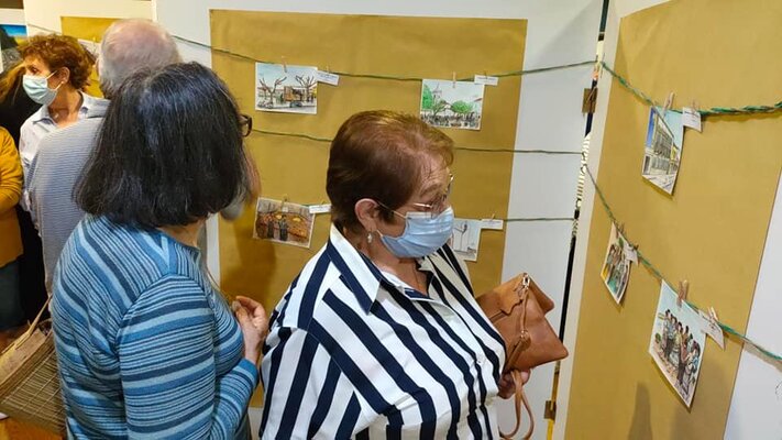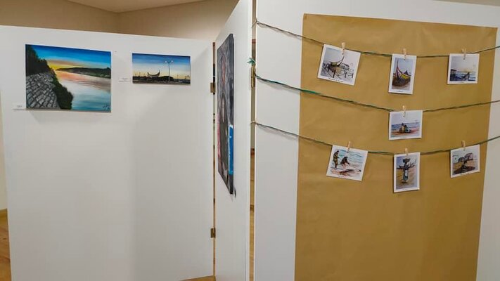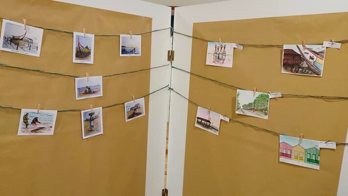 São apresentadas mais de 30 obras, entre quadros e postais, com recurso a técnica mista, óleo e aguarela.