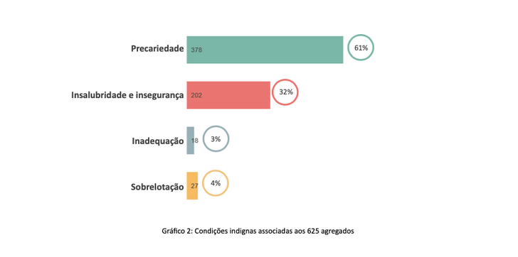Quanto à condição habitacional verificou-se que a maioria dos agregados, 378, vive em condições de precariedade, seguindo-se 202 em insalubridade e insegurança, depois a inadequação, com 18, e por fim, a sobrelotação, identificada em 27 agregados.
