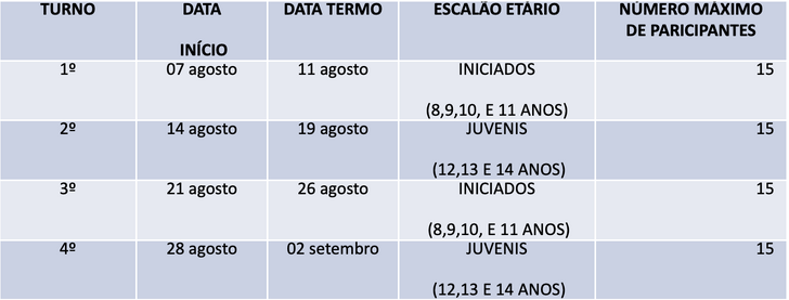 Os Campos de Férias de São Pedro de Moel compreendem os turnos e escalões etários em anexo.