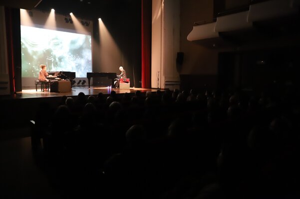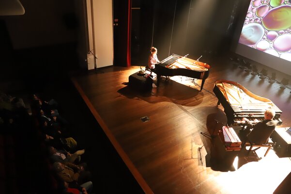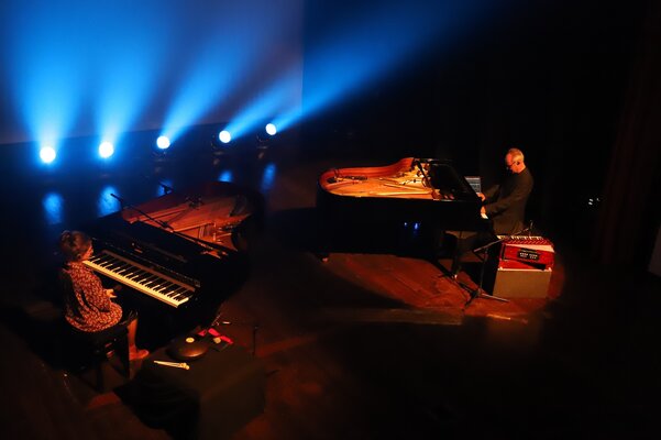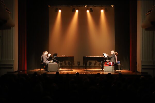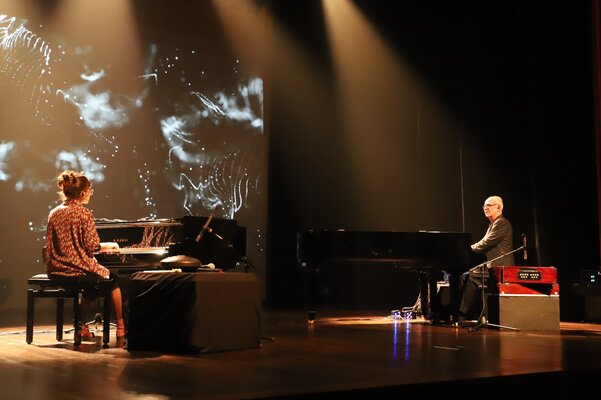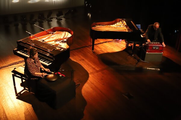 Em palco, os músicos ocuparam os dois pianos e tocaram outros instrumentos, cujas sonoridades se juntaram aos sintetizadores, em temas do novo disco, como Pandu, Rodant, Jagoz, Marzar, Irmãs ou o incontornável e já bem conhecido Tardes de Bolonha, ali interpretado apenas ao piano.