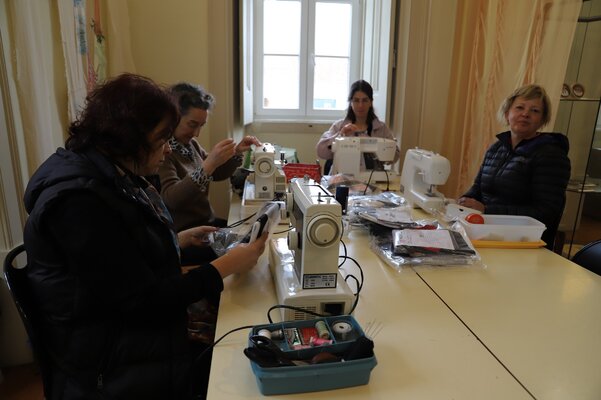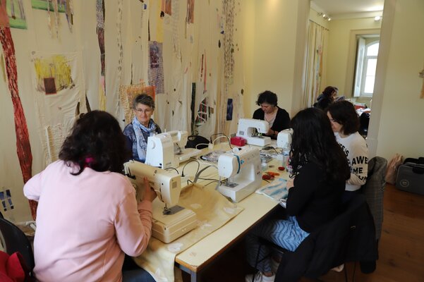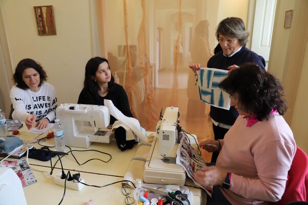 Ao seu entusiasmo, as formandas juntaram tecidos, agulhas, linhas e máquinas de costura, para criar uma bolsa, naquela oficina de experimentação do saber fazer em contexto museológico.
