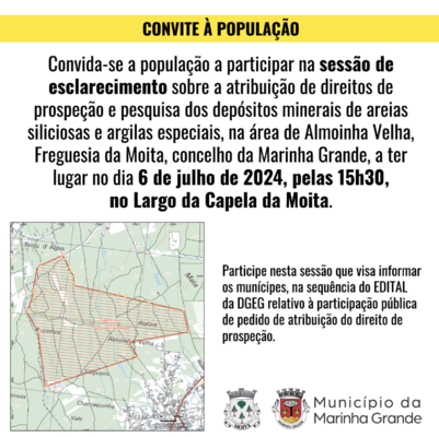 O Município da Marinha Grande e a Junta de Freguesia da Moita convidam a população a participar na sessão de esclarecimentos sobre a atribuição de direitos de prospeção e pesquisa dos depósitos minerais de areias siliciosas e argilas especiais, na área de Almoinha Velha, Freguesia da Moita, concelho da Marinha Grande, a ter lugar no dia 6 de julho de 2024, pelas 15h30, no Largo da Capela da Moita.