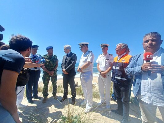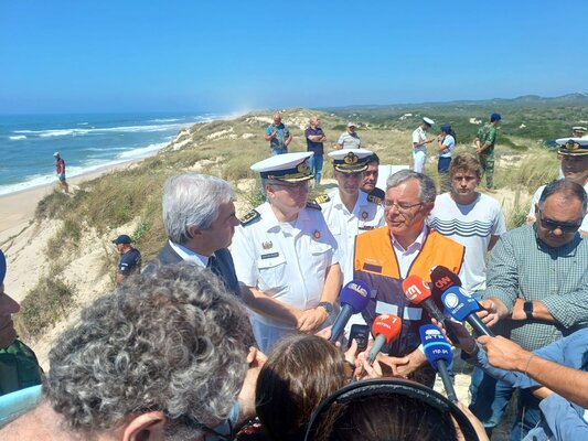 O Presidente da Câmara Municipal, Aurélio Ferreira; e elementos do Serviço Municipal de Proteção Civil, estão com o Ministro da Defesa Nacional, Nuno Melo; o Chefe de Estado Maior da Armada, almirante Henrique Gouveia e Melo,; e o Chefe de Estado Maior da Força Aérea, general João Cartaxo Alves; na Praia do Samouco, esta quinta-feira, 4 de julho, a acompanhar as operações de busca dos três pescadores que se encontram desaparecidos, na sequência do naufrágio da embarcação Virgem Dolorosa, ocorrido na madrugada de 3 de julho, a uma milha náutica (1 852 m) da costa daquela praia, no concelho da Marinha Grande.