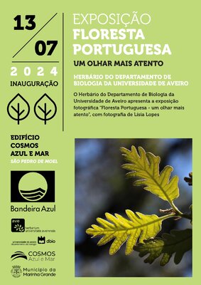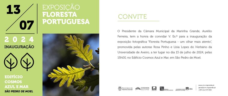 O Município da Marinha Grande inaugura a exposição “Floresta Portuguesa, Um Olhar mais Atento”, da autoria de Rosa Pinho e Lísia Lopes do Herbário da Universidade de Aveiro, no próximo sábado, 13 de julho, pelas 15h00, no Edifício Cosmos, em São Pedro de Moel.