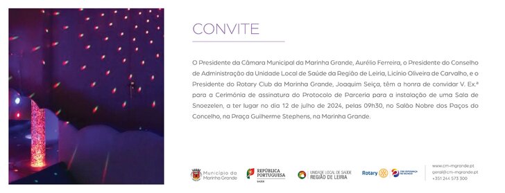 O Município da Marinha Grande, a Unidade Local de Saúde da Região de Leiria e o Rotary Club da Marinha Grande, vão celebrar um Protocolo de Parceria para a instalação de uma Sala de Snoezelen, no dia 12 de julho de 2024, pelas 09h30, no Salão Nobre dos Paços do Concelho, na Praça Guilherme Stephens, na Marinha Grande.
