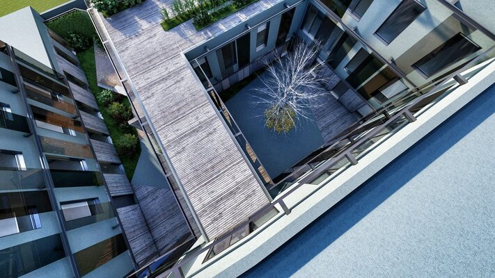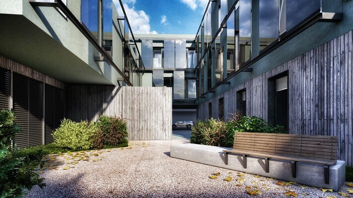 Em relação à forma do edificado proposto, o conceito que se procurou estabelecer foi algo que potenciasse o convívio social entre os residentes e também criasse um espaço interno visitável pela comunidade, como um amplo espaço de receção ao ar livre. O projeto desenvolve-se em volta de um pátio interno, aberto à comunidade, acessível pela Rua Alexandre Herculano.
