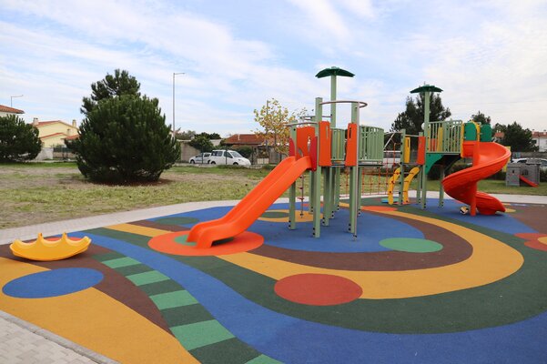No JI da Amieirinha, o pavimento tem marcados uma macaca e vários elementos gráficos. Estes jogos permitem dinamizar o espaço, ampliar a área destinada à brincadeira e garantir um uso mais dinâmico, transversal e inclusivo de toda a área de intervenção.