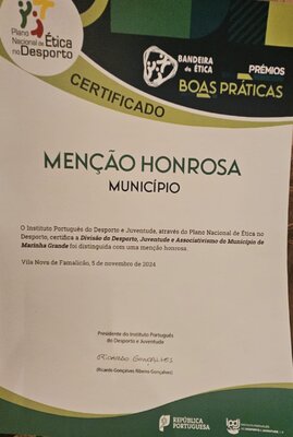 A Câmara Municipal da Marinha Grande recebeu uma Menção Honrosa, entregue por José Lima, coordenador do Plano Nacional da Ética no Desporto, pela adoção de políticas públicas que promovem os valores éticos por via da prática desportiva.