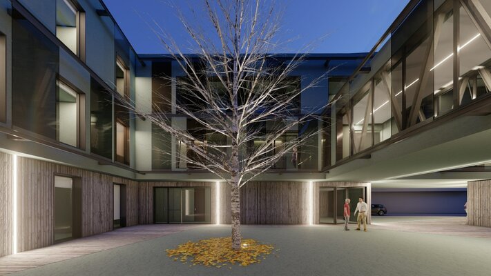 A reabilitação do edifício da antiga Albergaria Nobre, localizado na Rua Alexandre Herculano, contempla a utilização de vidro e um acabamento de fachada na cor verde garrafa em algumas fachadas. Propõe-se, também, uma relação com o pinhal através do acabamento exterior.