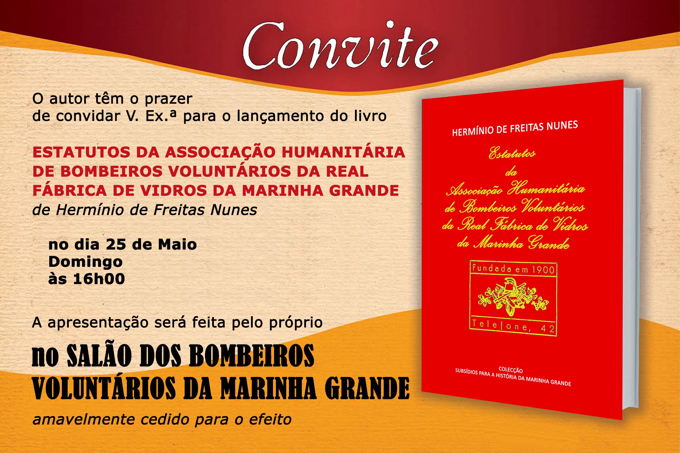 No próximo domingo, 25 de maio, pelas 16h00, será lançado o livro "Estatutos da Associação Humanitária de Bombeiros Voluntários da Real Fábrica de Vidros da Marinha Grande", da autoria de Hermínio de Freitas Nunes.