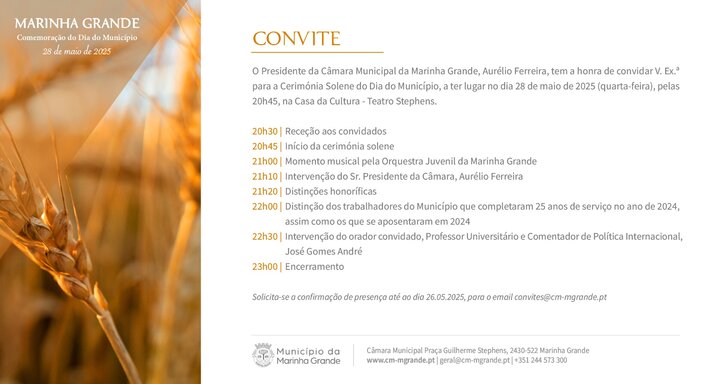 A Câmara Municipal da Marinha Grande vai assinalar o Dia do Município – celebrado na tradicional Quinta-Feira da Ascensão – com uma cerimónia solene a realizar-se no próximo dia 28 de maio, pelas 20h45, no Teatro Stephens. A iniciativa decorre na véspera do feriado municipal e tem como objetivo reconhecer o mérito de cidadãos, instituições e trabalhadores do concelho.