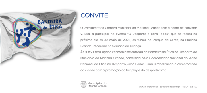 Às 10h30, será entregue ao Município da Marinha Grande a Bandeira da Ética no Desporto, numa cerimónia com o Juramento pela Ética Desportiva conduzida pelo Coordenador Nacional do Plano Nacional da Ética no Desporto (PNED), José Carlos Lima, e pelo Embaixador do PNED, José Sampaio e Nora.