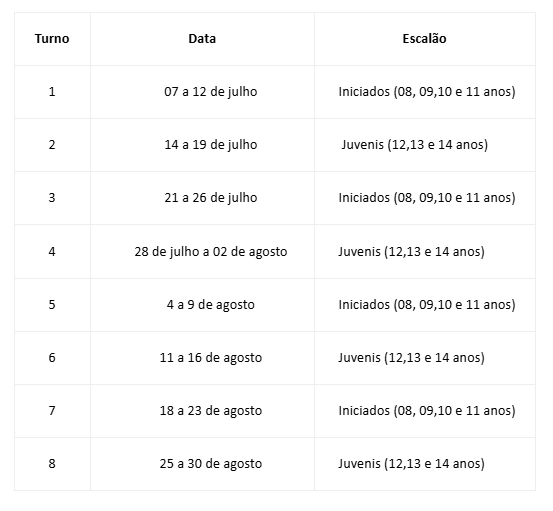Os Campos de Férias de São Pedro de Moel compreendem os seguintes turnos e escalões etários: