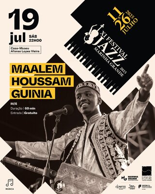 O jovem mestre da música Gnawa, Houssam Guinia, traz à Marinha Grande os sons hipnóticos do folclore cerimonial da África Ocidental. Herdeiro de uma linhagem musical transmitida de geração em geração, Houssam é filho de Mahmoud Guinia, uma das maiores referências deste género. O concerto transporta o público para uma viagem sonora espiritual e profunda, através do uso do tradicional instrumento guembri e de ritmos ancestrais com grande carga simbólica e curativa.