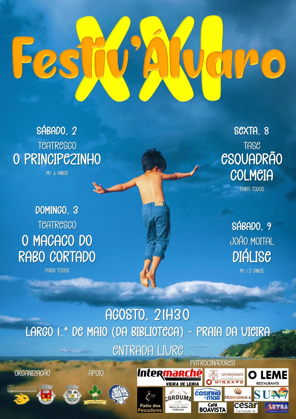O Teatresco e a Câmara Municipal da Marinha Grande vão coorganizar o XXI Festiv’Álvaro no Largo 1º de Maio (da Biblioteca), situado na Praia da Vieira, durante o mês de agosto.