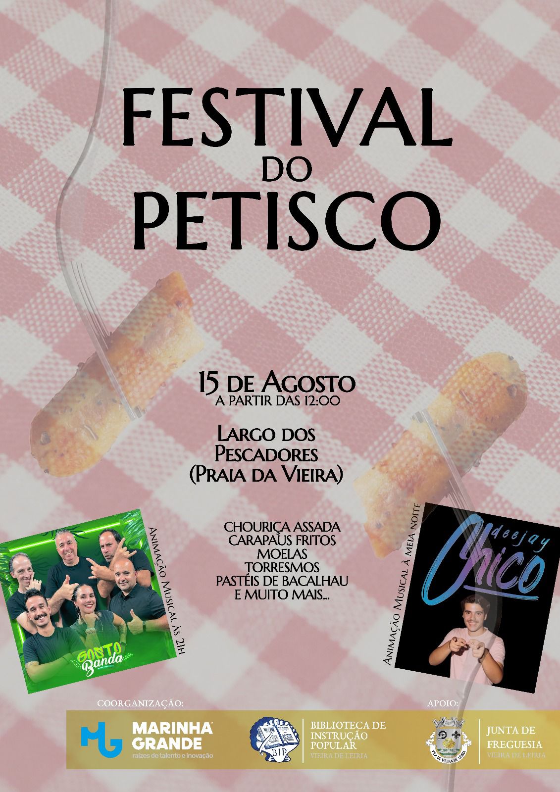 O Largo dos Pescadores, na Praia da Vieira, será palco de dois dias de celebração cultural e gastronómica, com a realização do III Festival do Petisco e do XXXVII Festival Nacional de Folclore, nos dias 15 e 16 de agosto, respetivamente, numa organização conjunta do Município da Marinha Grande e da Biblioteca de Instrução Popular (BIP), e contando com o apoio da Junta de Freguesia da Vieira de Leiria, no âmbito da programação da época balnear.