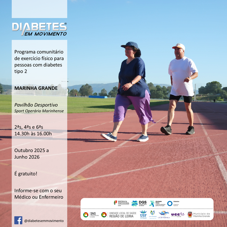 O programa comunitário "Diabetes em Movimento", dirigido a pessoas com diabetes tipo 2, vai retomar as suas atividades na Marinha Grande a partir do dia 1 de outubro de 2025, decorrendo até junho de 2026.