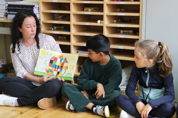 A sessão incluiu uma atividade de apresentação entre os alunos, a leitura da história do “Elmer” - o elefante colorido e uma dinâmica de grupo que incentivou cada criança a identificar duas coisas em comum com os colegas, reforçando o sentido de pertença e o respeito pela diferença.