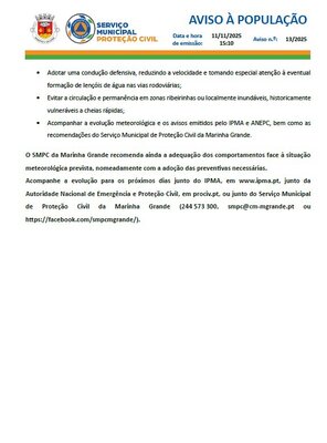 Acompanhe a evolução para os próximos dias junto do IPMA, junto da Autoridade Nacional de Emergência e Proteção Civil , ou junto do Serviço Municipal de Proteção Civil da Marinha Grande (+351 244 573 300, smpc@cm-mgrande.pt ou via Facebook ).