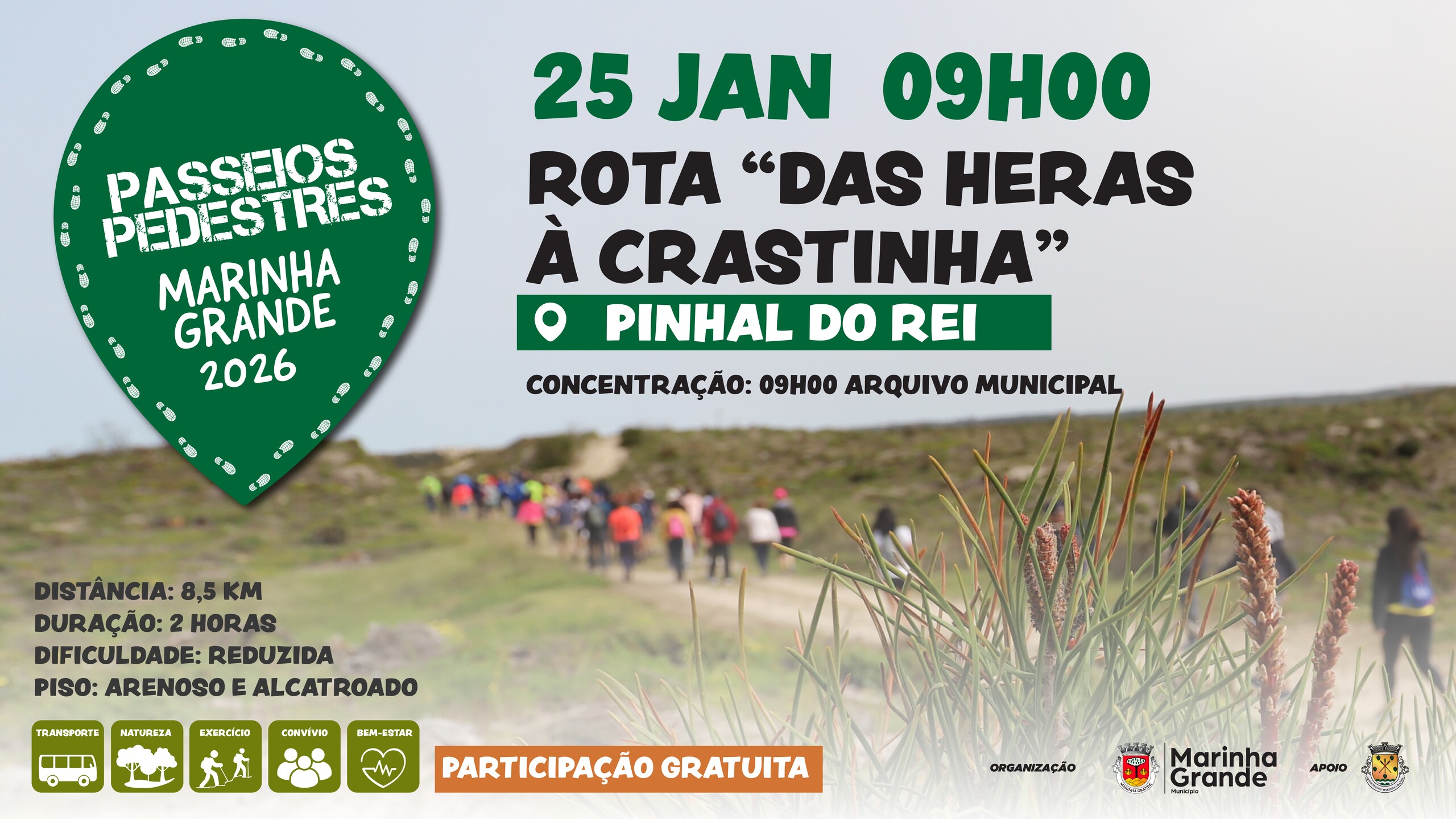 A “Rota das Heras à Crastinha” vai percorrer o Pinhal do Rei, no próximo dia 25 de janeiro (domingo), às 09h00, naquele que é o primeiro passeio pedestre de 2026, organizado pelo Município da Marinha Grande, cuja participação é gratuita.