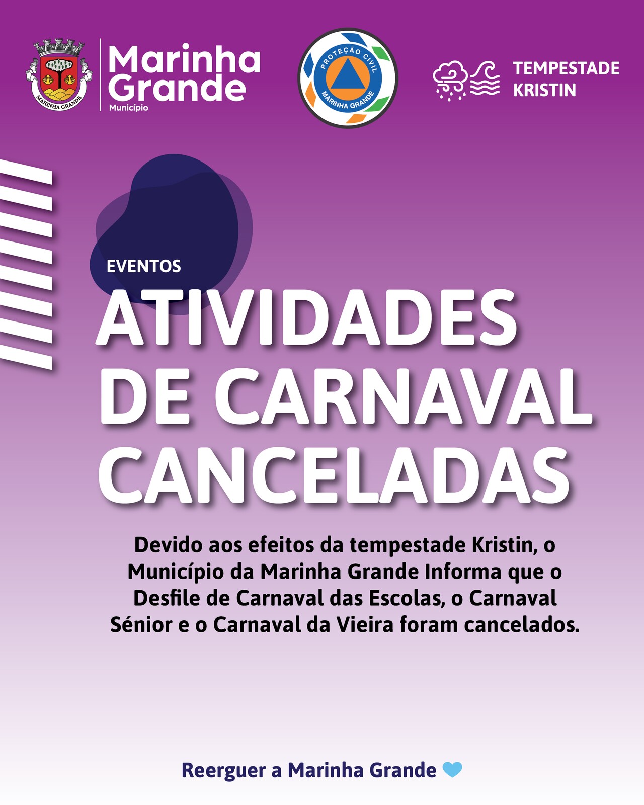 O Município da Marinha Grande informa que, devido à situação excecional vivida no concelho, na sequência da tempestade Kristin, e considerando o impacto significativo sobre a população, as infraestruturas, as instituições e os serviços essenciais, todas as atividades de Carnaval promovidas pela autarquia ficam canceladas.