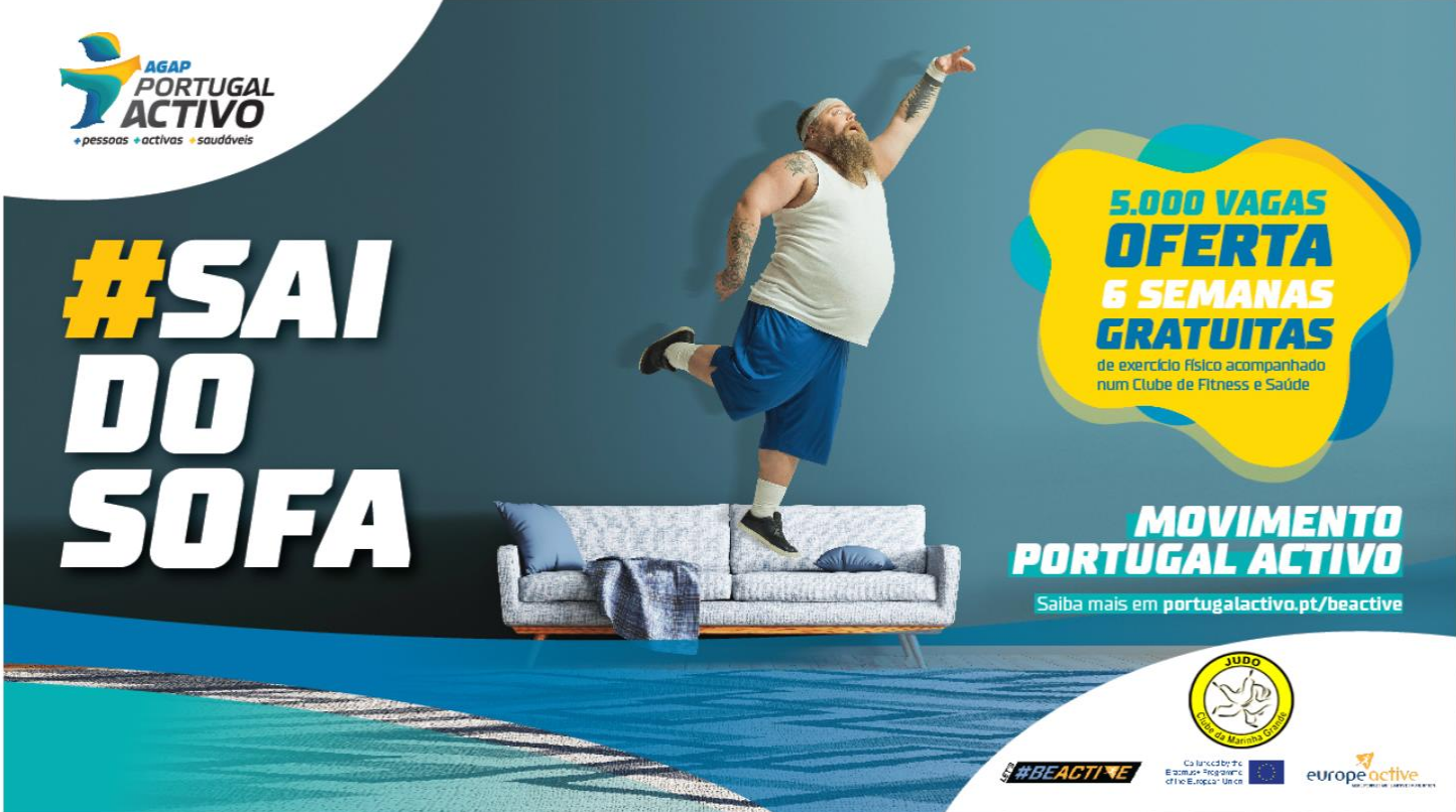 O Judo Clube da Marinha Grande integra a campanha europeia #beactive que pretende estimular a prática de atividade física a todas as pessoas, independentemente do contexto social, idade ou aptidão física. #saidosofa é uma iniciativa enquadrada no Movimento Portugal Activo, que tem como objetivo tornar Portugal num “País mais saudável e mais ativo através da prática desportiva acompanhada”, a ação inicia-se a 9 de março 2020 oferecendo 6 semanas de treino gratuito no Judo clube da Marinha Grande, numa das classes de Treino Funcional Nível I e nível II ou iniciação ao Judo.