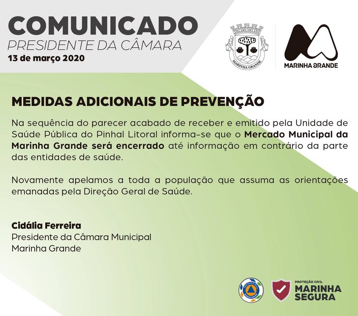 COMUNICADO - MAIS MEDIDAS DE PREVENÇÃO - ENCERRAMENTO DO MERCADO DA MARINHA GRANDE