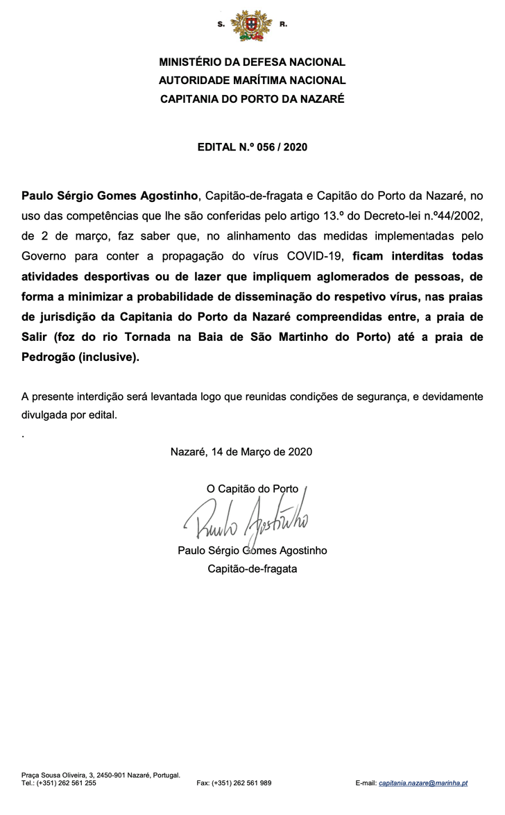 Comunicado da Autoridade Marítima Nacional - Capitania do Porto da Nazaré em que se interditam todas atividades desportivas ou de lazer que impliquem aglomerados de pessoas em todas as praias do nosso concelho.