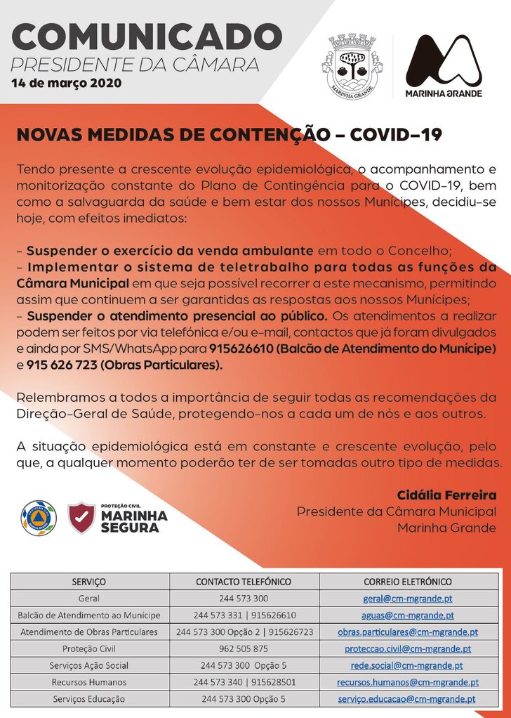- Suspender o atendimento presencial ao público. Os atendimentos a realizar podem ser feitos por via telefónica e/ou e-mail, contactos que já foram divulgados e ainda por SMS/WhatsApp para 915626610 (Balcão de Atendimento do Munícipe) e 915 626 723 (Obras Particulares).