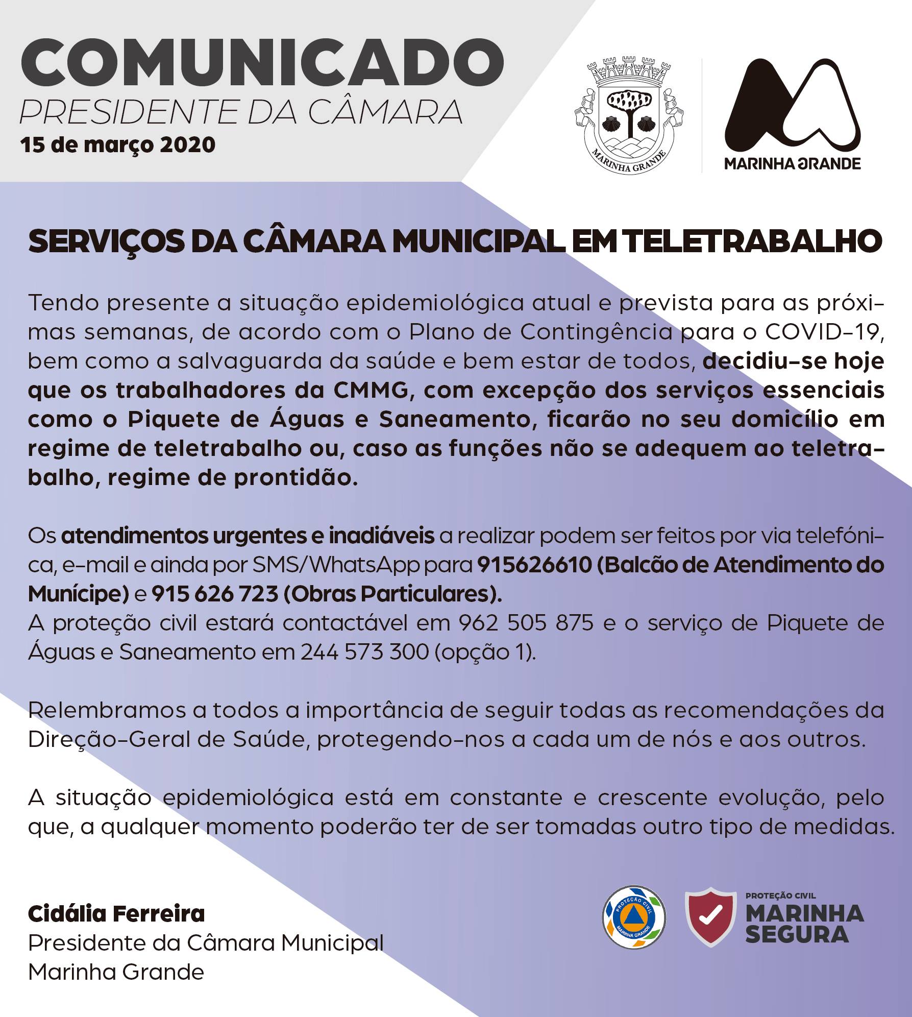 Tendo presente a situação epidemiológica atual e prevista para as próximas semanas, de acordo com o Plano de Contingência para o COVID-19, bem como a salvaguarda da saúde e bem estar de todos, decidiu-se hoje que os trabalhadores da CMMG, com excepção dos serviços essenciais como o Piquete de Águas e Saneamento, ficarão no seu domicílio em regime de teletrabalho ou, caso as funções não se adequem ao teletrabalho, regime de prontidão.