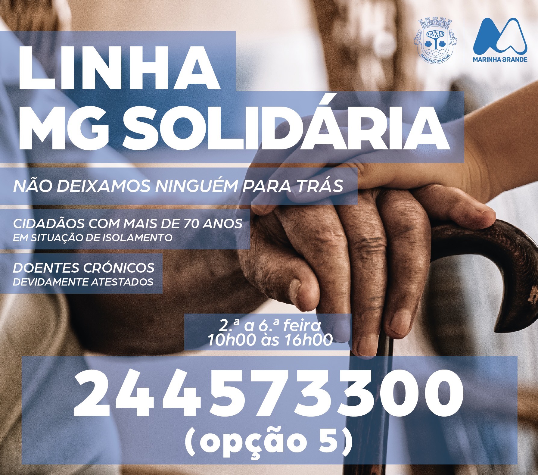 Caso necessite de apoio e esteja abrangido pelas regras, deverá contactar a linha de apoio do Serviço Social da Câmara Municipal da Marinha Grande, através do telefone 244573300 (opção 5).