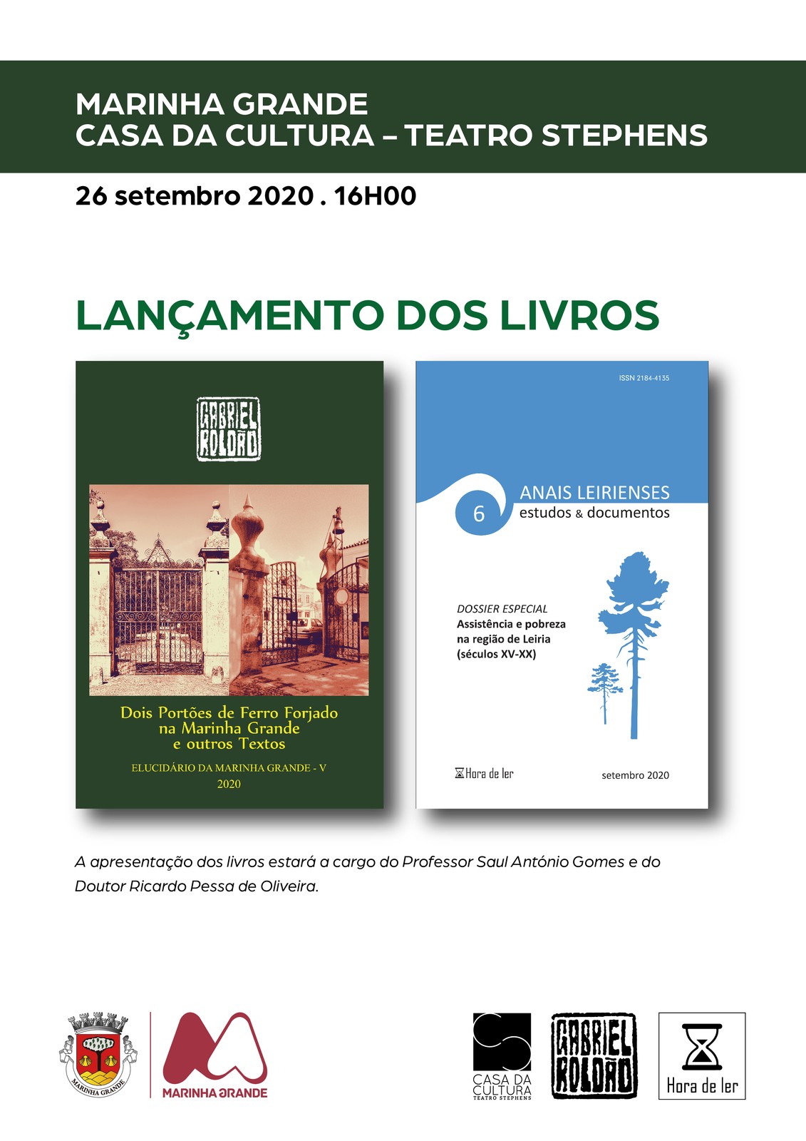 A Casa da Cultura Teatro Stephens recebe a sessão de apresentação dos livros “Anais Leirienses– estudos & documentos – volume n.º 6, de vários autores, e “Dois Portões de Ferro Forjado na Marinha Grande e outros Textos”, de Gabriel Roldão, da Editora Hora de Ler, no próximo sábado, 26 de setembro, pelas 16h00.