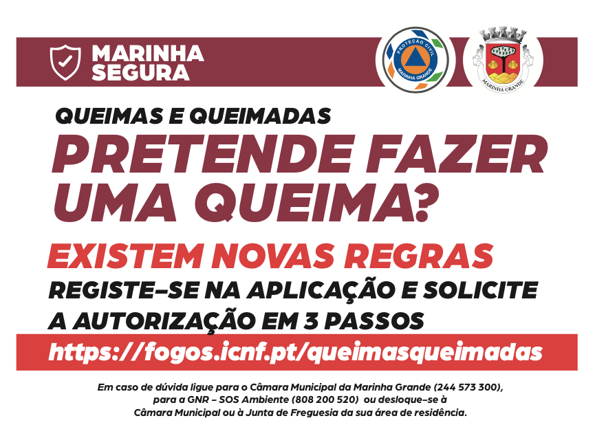 A queimada, fora do período critico e quando o índice de risco de incêndio não seja de níveis muito elevado ou máximo, está sujeita a autorização da Câmara Municipal de Marinha Grande;