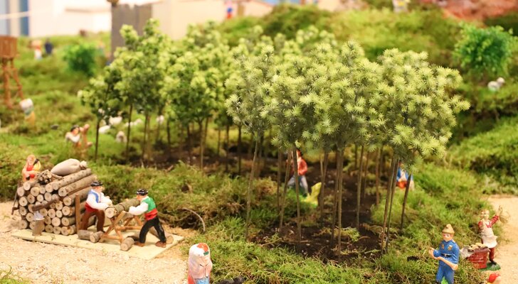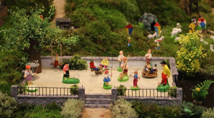 Existem ainda moinhos, um poço com a nora e o burro a rodar para tirar a água, um oleiro a moldar o barro, um parque infantil, um lago com patos e até os guardas no castelo, também em movimento. A água também marca presença com cascatas e várias fontes de água. Não falta também, o já habitual comboio em movimento sobre as suas linhas que encanta sempre miúdos e graúdos, com uma estação onde pára, para entrada e saída dos passageiros.