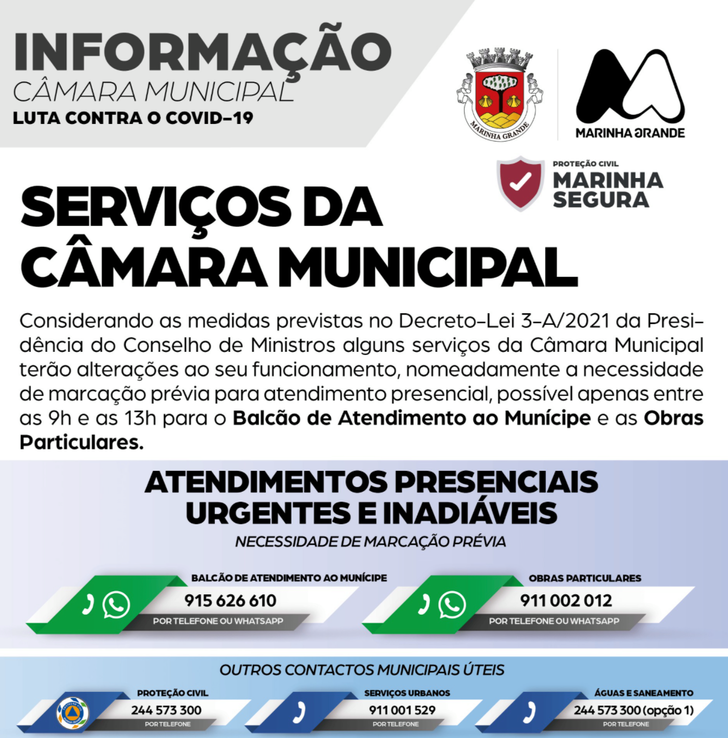 Considerando as medidas previstas no Decreto-Lei 3-A/2021 da Presidência do Conselho de Ministros alguns serviços da Câmara Municipal terão alterações ao seu funcionamento, nomeadamente a necessidade de marcação prévia para atendimento presencial, possível apenas entre as 9h e as 13h para o Balcão de Atendimento ao Munícipe e as Obras Particulares.