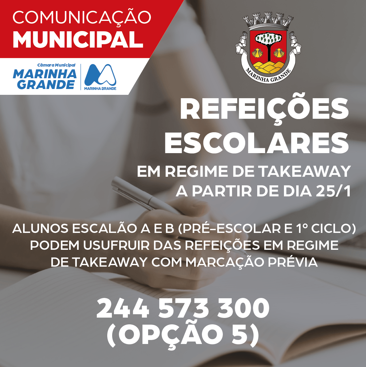 A Câmara Municipal da Marinha Grande vai assegurar as refeições escolares às crianças do ensino pré-escolar e do 1º ciclo, beneficiárias dos escalões A e B, em regime de takeaway, durante o período em que as escolas estarão encerradas, no âmbito do estado de emergência.