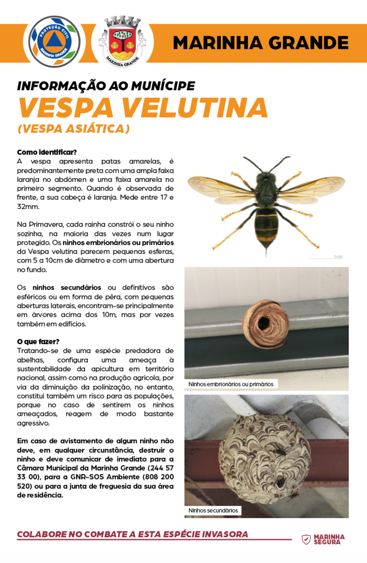 A Câmara Municipal da Marinha Grande alerta a população para a adoção de comportamentos que visem a identificação e a disseminação da vespa asiática no concelho, de modo a diminuir o seu impacto nas zonas onde já se encontra instalada, erradicar novos focos em zonas ainda não ocupadas e prevenir a disseminação da espécie a outras áreas.