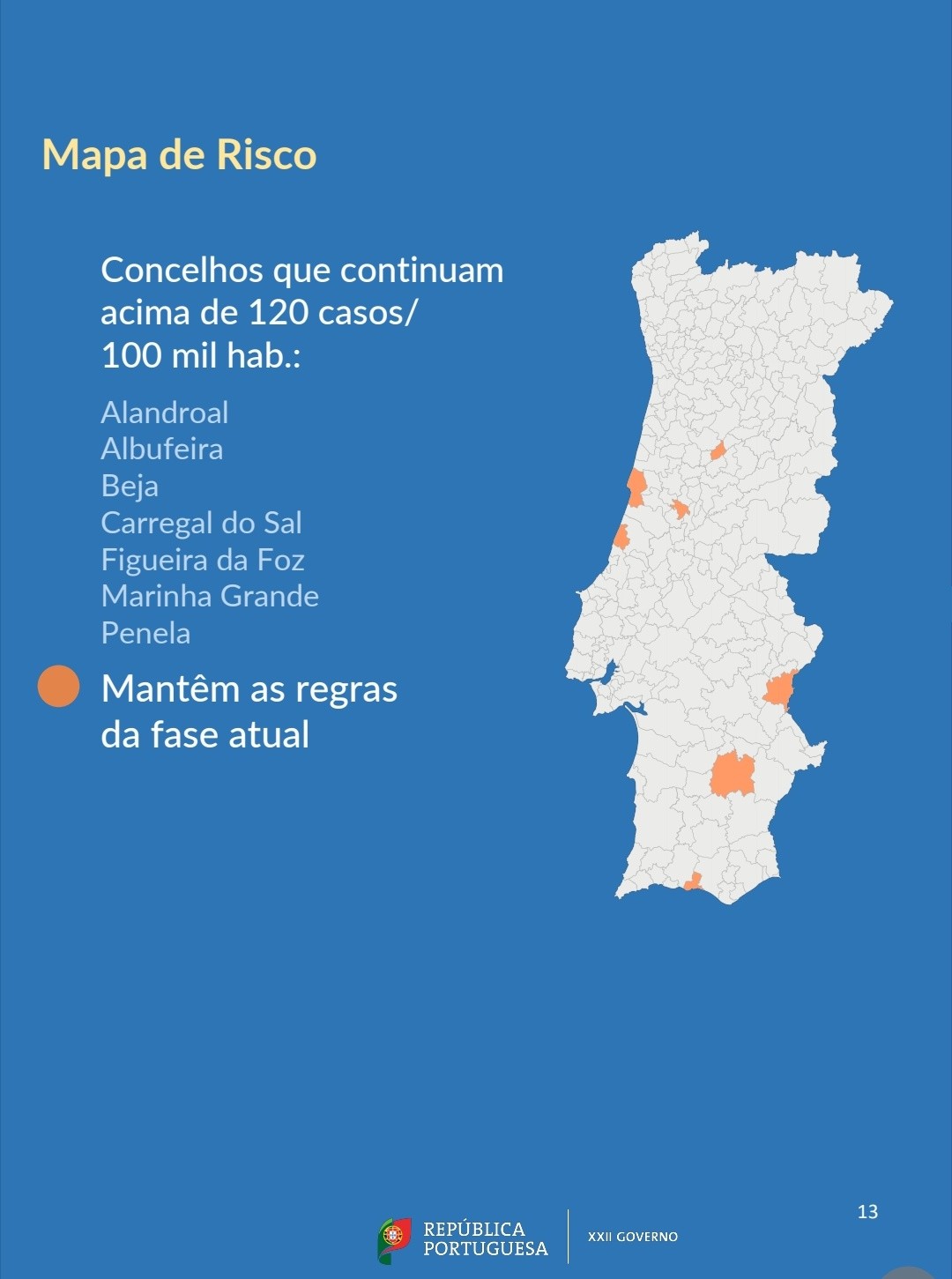 Nesta categoria, estão os concelhos que, pela segunda avaliação quinzenal consecutiva, se encontram com uma taxa de incidência superior a 120 casos por 100 mil habitantes nos últimos 14 dias. Assim, são sete os concelhos que irão permanecer na segunda fase do plano de desconfinamento: Alandroal, Albufeira, Beja, Carregal do Sal, Figueira da Foz, Marinha Grande e Penela. Assim, as medidas que vão continuar em vigor nestes concelhos são as seguintes: