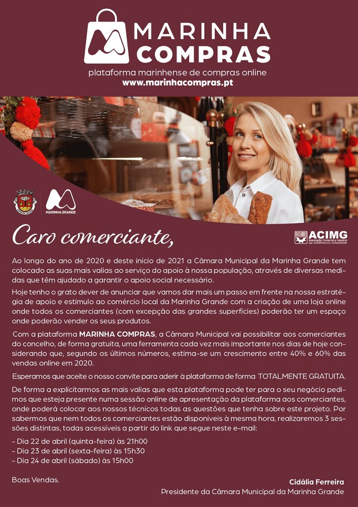 A Câmara Municipal convida todos os comerciantes da Marinha Grande a marcar presença na sessão de esclarecimento online sobre a Loja Online da Marinha Grande.