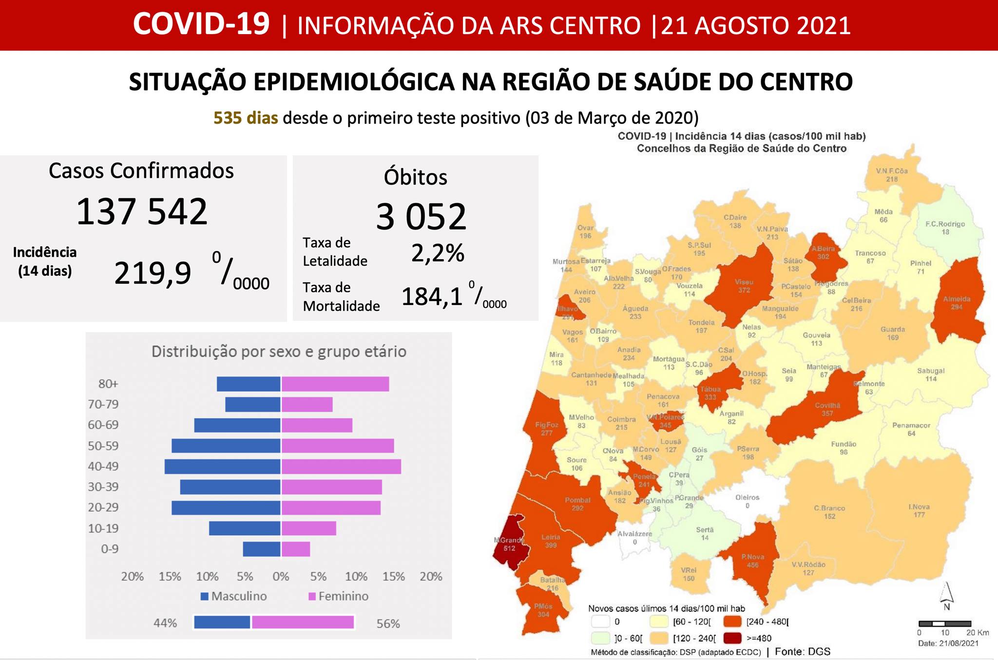 Como se pode ver na imagem, no mês de agosto chegámos a ser o concelho da zona centro com maior incidência de COVID a 14 dias por 100 mil habitantes.